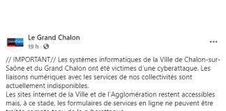 Les systèmes informatiques de la ville et de l’agglomération de Chalon-sur-Saône (Saône-et-Loire) ont subi un piratage informatique, a annoncé dimanche la collectivité du Grand Chalon sur Facebook. Dmanche 21 février, à 19 heures, la collectivité du Grand Chalon idiquait sur son compte Facebook : “Les systèmes informatiques de la Ville de Chalon-sur-Saône et du Grand … Lire la suite de La ville et l’agglomération de Chalon-sur-Saône cyberattaquées