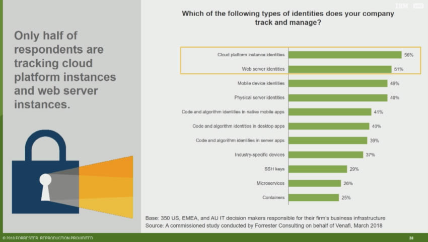 Seules les identités d’instances de plateformes Cloud et celles des serveurs Web sont gérées par la moitié des décideurs d’infrastructures sondés récemment par le cabinet Forrester (voir le graphique ci-dessous). C’est la partie visible de l’iceberg auquel Venafi tente de fournir une visibilité complète, ainsi qu’aux risques associés aux divers environnements applicatifs (mobiles, industriels, micro-services, conteneurs), traversés du siège aux succursales, en passant par les connexions à distance, les usages Cloud et multi-Cloud. Le défi actuel consiste, selon l’éditeur, à préserver en temps réel des flux d’informations entre des machines fiables tout en interdisant la communication avec des machines non fiables.