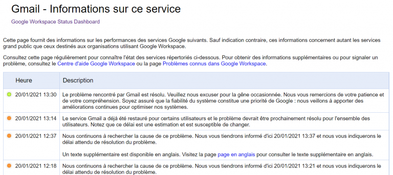 Alors que Google a subi une panne générale de tous ses services en décembre, cette fois-ci, c’est la messagerie Gmail qui a vu son accès perturbé le jeudi 20 janvier, et même la veille, rendant impossible son utilisation pour certains utilisateurs. L’incident a touché en particulier l’Europe, dont la France. Hier, Google indiquait à 13h30 … Lire la suite de Un problème technique a affecté Gmail en Europe, sans que l’on en connaisse la raison