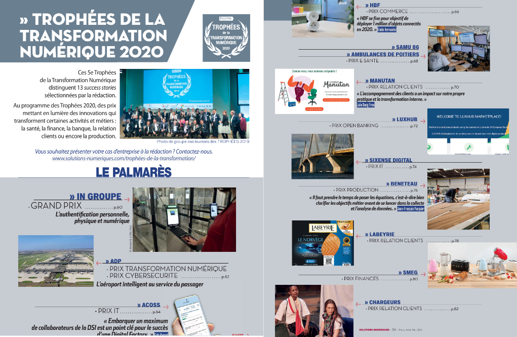 La Rédaction n’a pas pu tenir, en raison de l’épidémie, sa grande soirée annuelle pour la remise de ses Trophées de la Transformation Numérique qui devait se tenir le 17 mars – ce n’est que partie remise. Mais vous pouvez découvrir dans notre numéro dédié les entreprises qui ont été récompensées, ainsi que leurs témoignages: de IN Groupe, l’ancienne Imprimerie Nationale, à Manutan.
